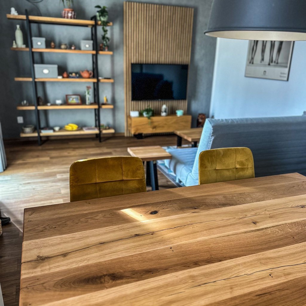 Massive Eichentischplatte im rustikalen Look: Die Eichenplatte mit feinen Rissen und Ästen ist mit schwarzem Epoxidharz oder Spachtel geschlossen, was den einzigartigen Charakter jedes Einzelstücks betont.